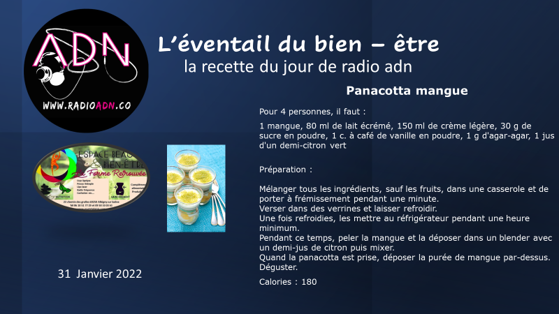 Mélanger tous les ingrédients, sauf les fruits, dans une casserole et de porter à frémissement pendant une minute. Verser dans des verrines et laisser refroidir. Une fois refroidies, les mettre au réfrigérateur pendant une heure minimum. Pendant ce temps, peler la mangue et la déposer dans un blender avec un demi-jus de citron puis mixer. Quand la panacotta est prise, déposer la purée de mangue par-dessus. Déguster.